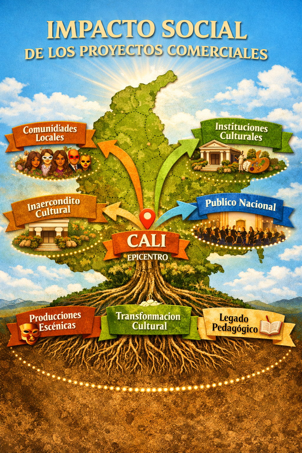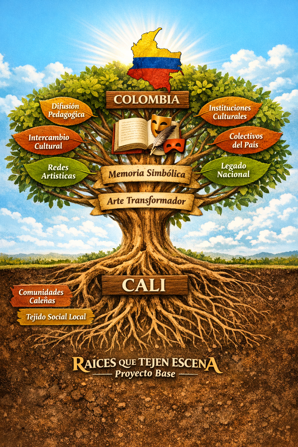 "Desde las raíces profundas de Cali florecen ramas que abrazan a Colombia: el arte compartido como vínculo, memoria y transformación."