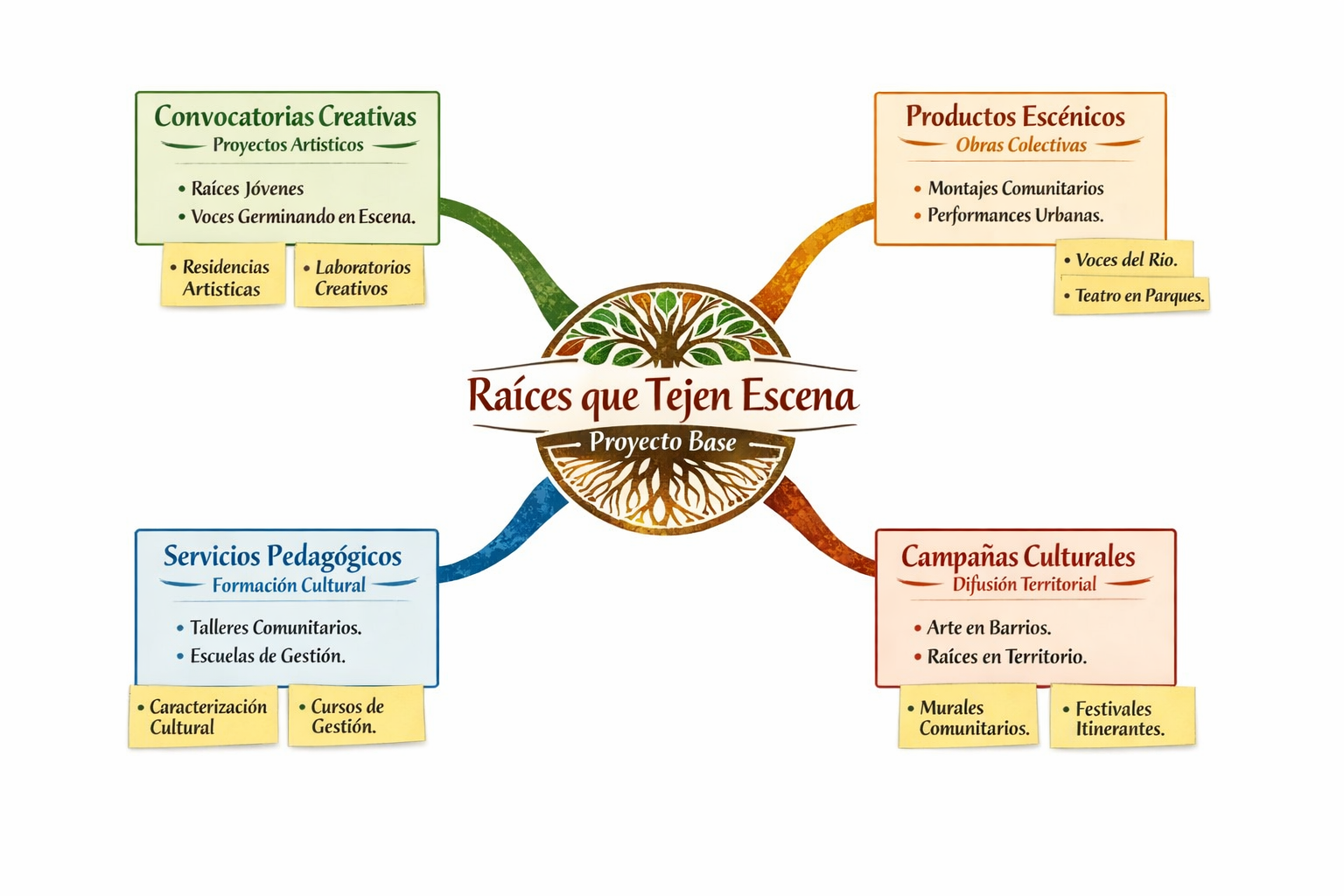 Raíces que Tejen Escena es el proyecto base de FUNTEMILLA, un segundo acto que honra la semilla inicial y profundiza en las raíces como símbolo de conexión, memoria y tejido social. Este proyecto articula tres pilares teatrales —Sófocles, Brecht y Lehmann— para generar catarsis emocional, crítica y experiencial, convirtiendo a la comunidad en protagonista activa de procesos artísticos, pedagógicos y culturales. Desde aquí nacen convocatorias creativas, productos escénicos colectivos, servicios pedagógicos con identidad institucional y campañas culturales que expanden el arte hacia nuevos territorios, fortaleciendo el tejido social y dejando un legado cultural que trasciende generaciones.